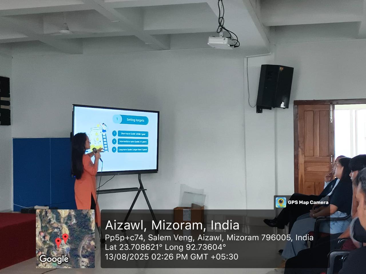 The second resource person to speak was Dr. Lalnunmawii Ralte, Assistant Professor, Department of Commerce, Government Aizawl College. She spoke about the need for and the rewards that can come from good financial planning. She taught the students the process of personal financial planning, basics of mutual fund investment, how to set financial goals and how to break down long term plans into actionable goals. She also highlighted the importance of being financially educated and exhorted the students to be aware of their social and political environment as it will eventually affect their financial situation in the future. She made them memorise “5 red flags” of financial scams as well.