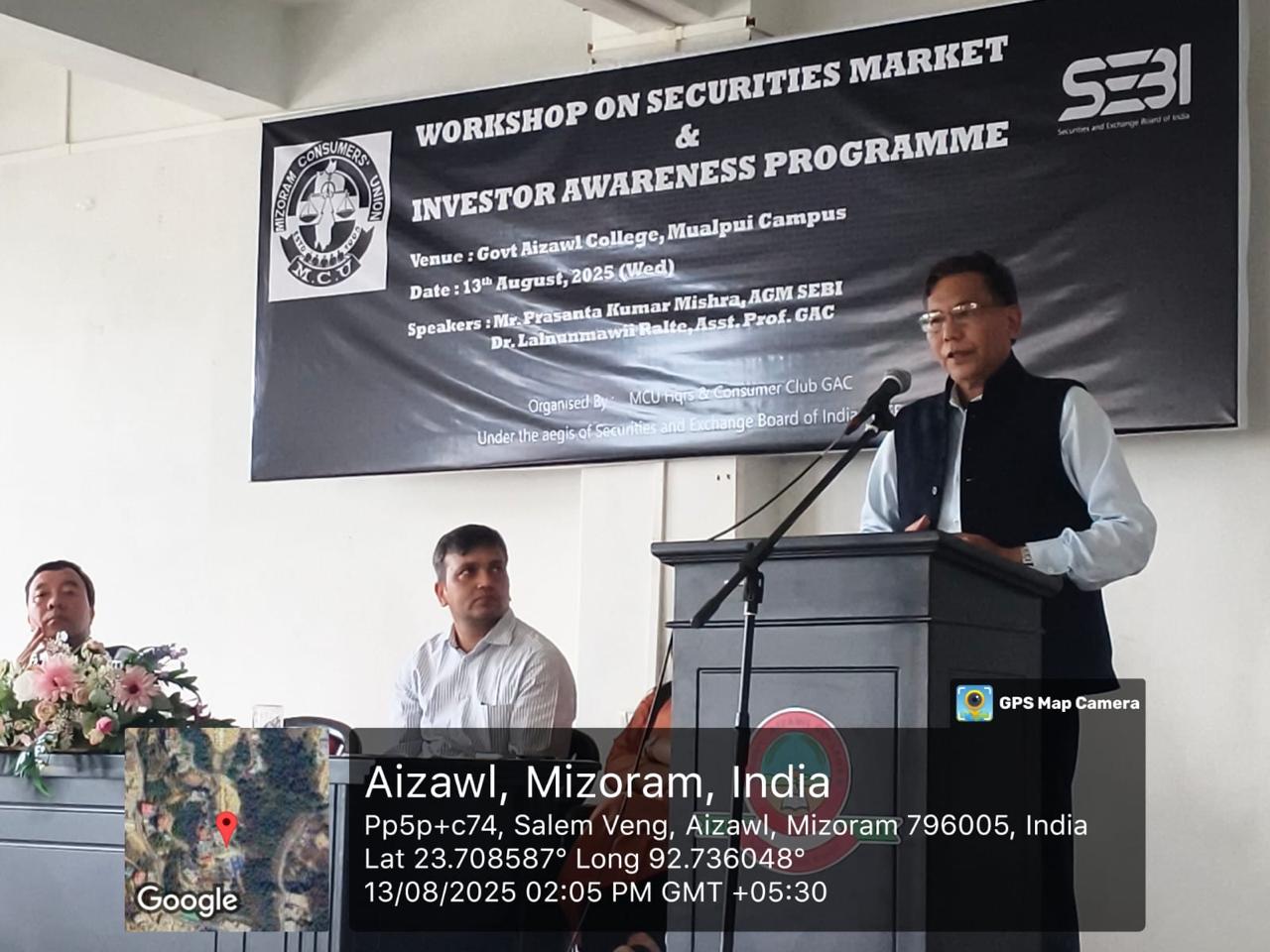 The Mizoram Consumers’ Union and the Consumer Club, Government Aizawl College organised a programme for undergraduate students titled “Workshop on Securities Market & Investor Awareness Programme” on August 13, 2025 (Wednesday) at the Conference Hall, Government Aizawl College, Mualpui campus, Aizawl. The resource persons for the programme were Mr. Prasanta Kumar Mishra, Assistant General Manager, SEBI, Kolkata and Dr. Lalnunmawii Ralte, Assistant Professor, Department of Commerce, Government Aizawl College.