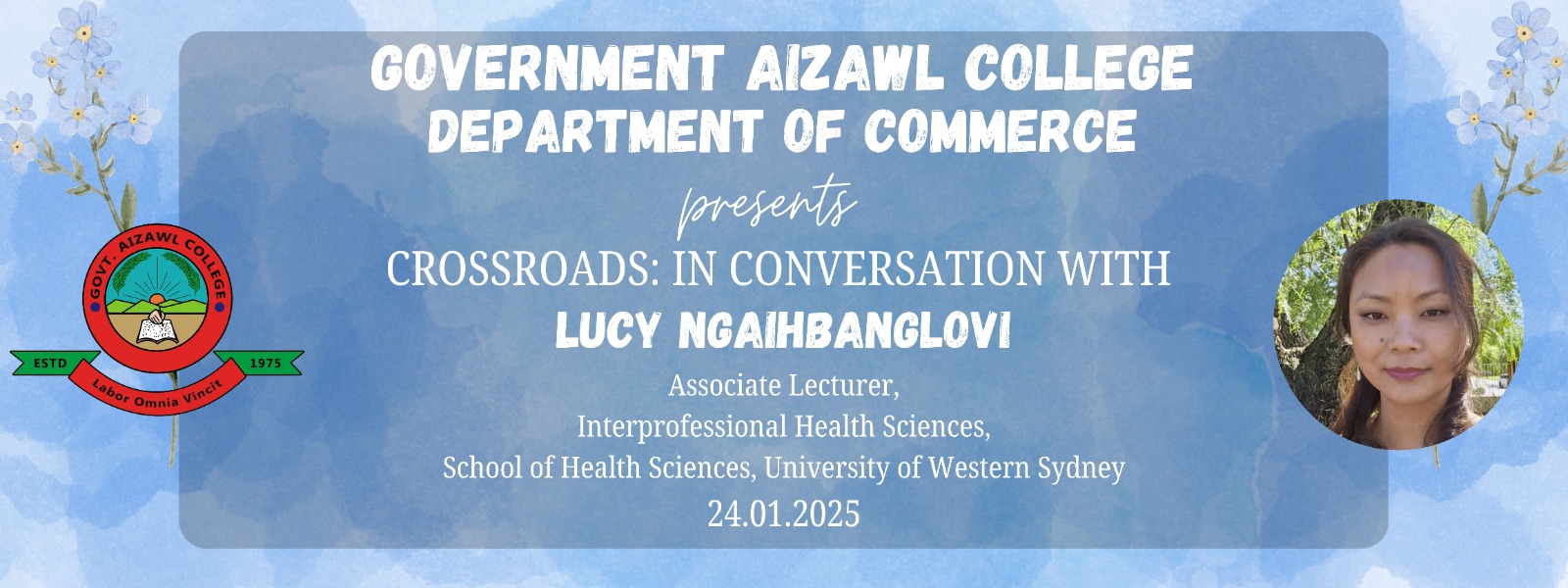 The Department of Commerce was introduced as a separate academic stream in 1986 when the College was still affiliated to North Eastern Hill University (NEHU). Initially, the Department offered only the Pre-University (P.U.) course under the tutelage of two faculty members - Prof. Laishram Gyanendra Singh (who retired in 2021), the first Head of Department and Ms. Lalremruati (the current Vice Principal). Forty students attended evening classes then. Eventually, the B.Com degree was introduced in 1988, still under NEHU. The affiliation was changed to Mizoram University when it was established in 2001. When the Choice Based Credit System (CBCS) was introduced in 2016, the Department followed suit; and did the same with the introduction of the National Education Policy (NEP) 2020 syllabus from the 2023 academic session onwards. At present, there are 8 teaching faculty members.