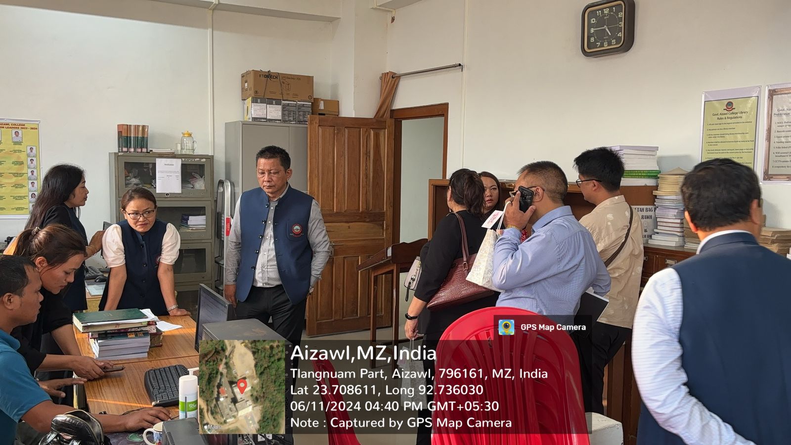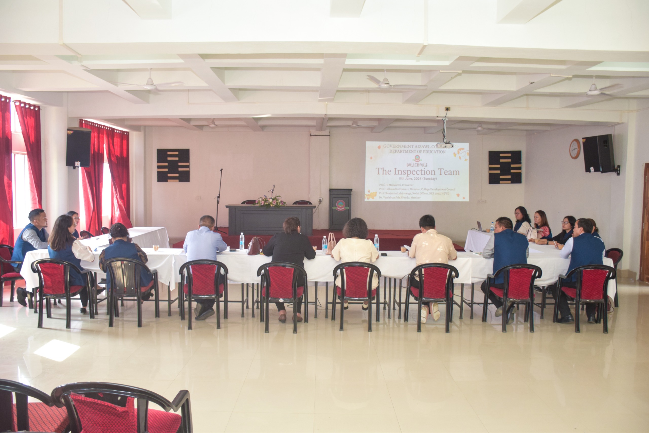 The inspection team gathered with the principal, Mr Lalbiakzuala, the Vice Principal, Dr. Lalsangzuala Khiangte, and faculty members of Education Department at the Conference Hall for the interaction. After a welcome address from the principal, Dr Mary L Renthlei, Convener, MA Education, gave a presentation on MA Education highlighting the issues and challenges faced by the department and the progress and achievements as well. She described in detail the necessary information according to the requirements mentioned in the affiliation form including how recommendations from the first inspection have been met. Interaction followed where queries were responded by the principal and the faculty members of the department. MA classrooms, department faculty room, laboratory equipment and psychological tests of the department and other important documents, as well as the college library were then inspected. All faculty members of the department were present for the occasion.