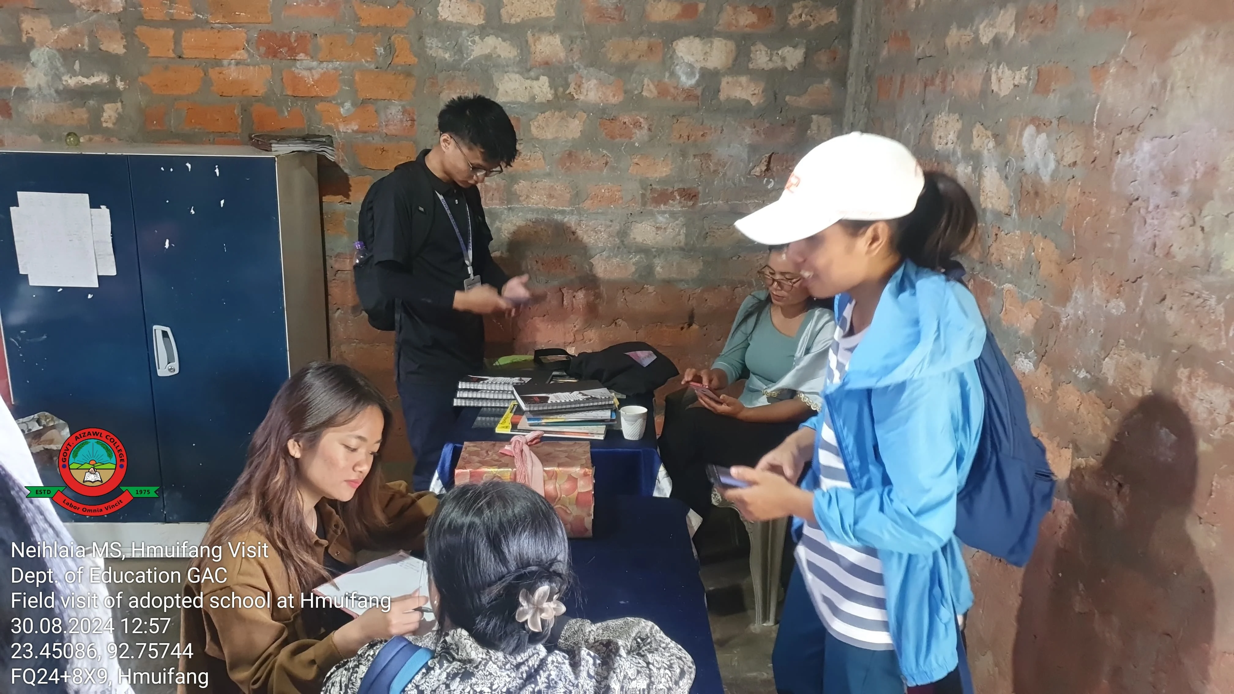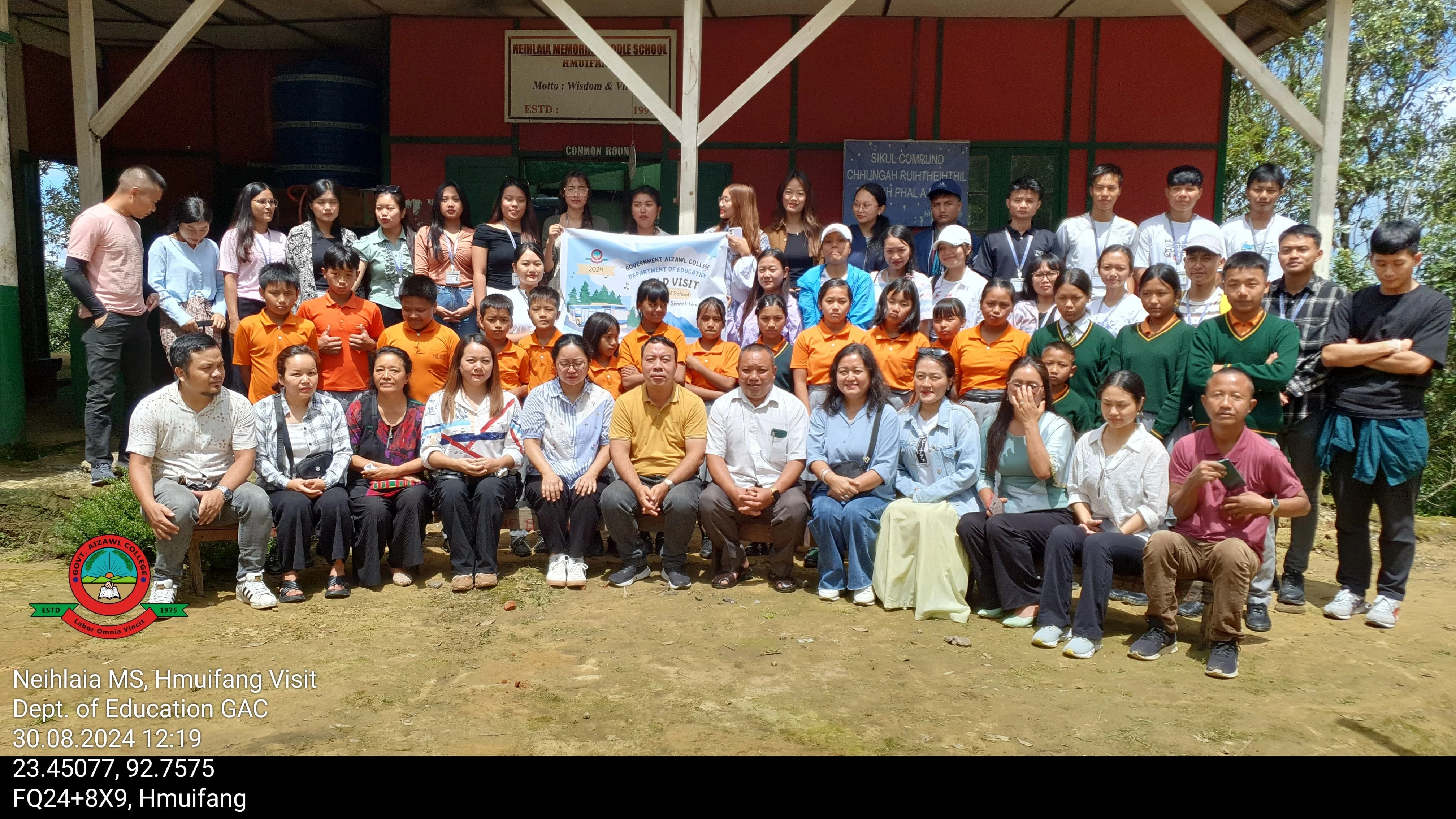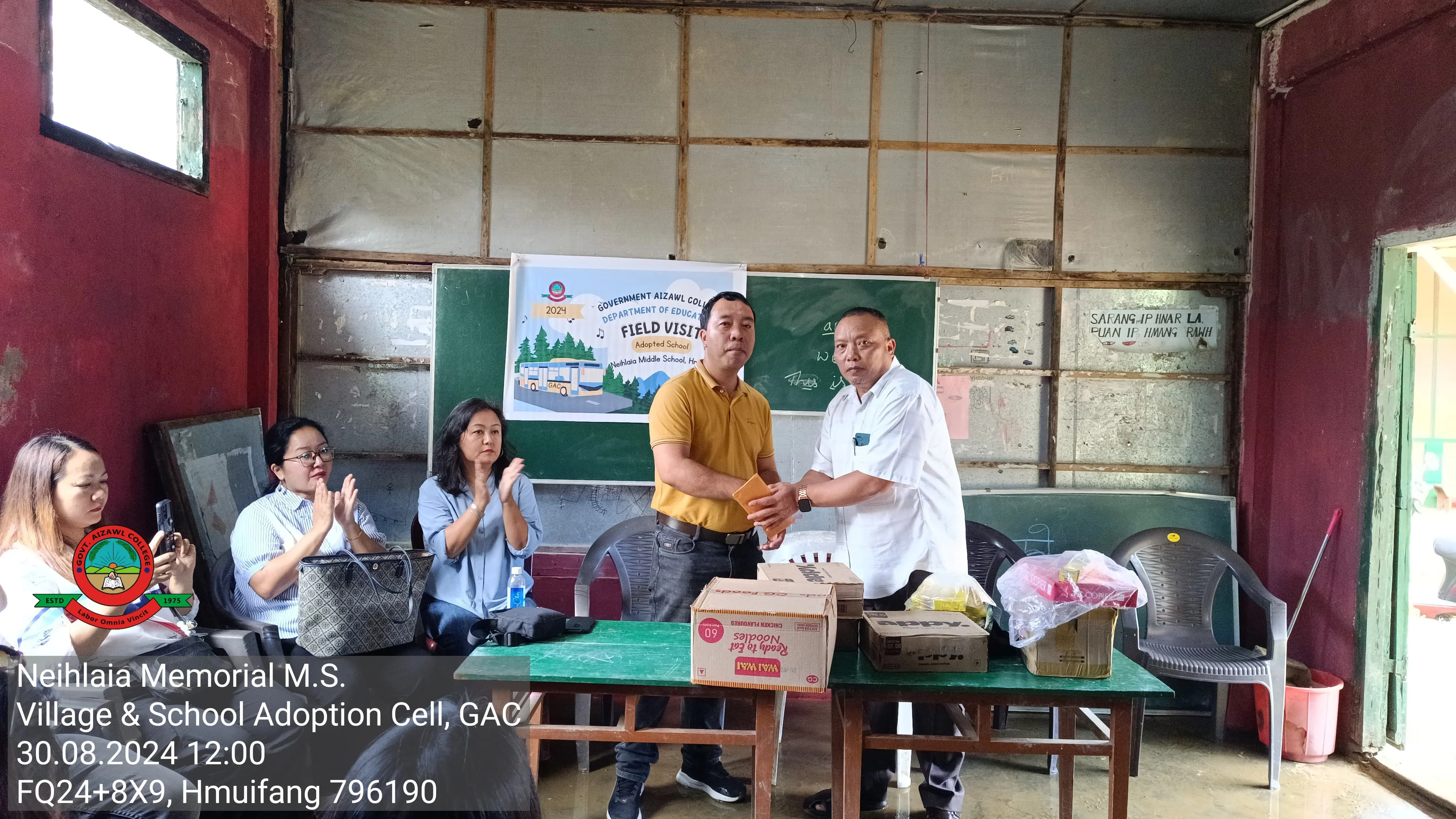 The Department of Education and Village & School Adoption Committee visited Neihlaia Memorial Middle School at Hmuifang on August 30, 2024. Stationery items as well as drinks and snacks were gifted by the department and the Vice Principal Dr. Lalsangzuala Khiangte handed over Rs. 25000/- for school development purposes as financial assistance from the college. Students collected data from teachers and students of the school using interview and observation methods which will be compiled and submitted to the college for documentation. The team consisted of 32 students and 8 faculty members.