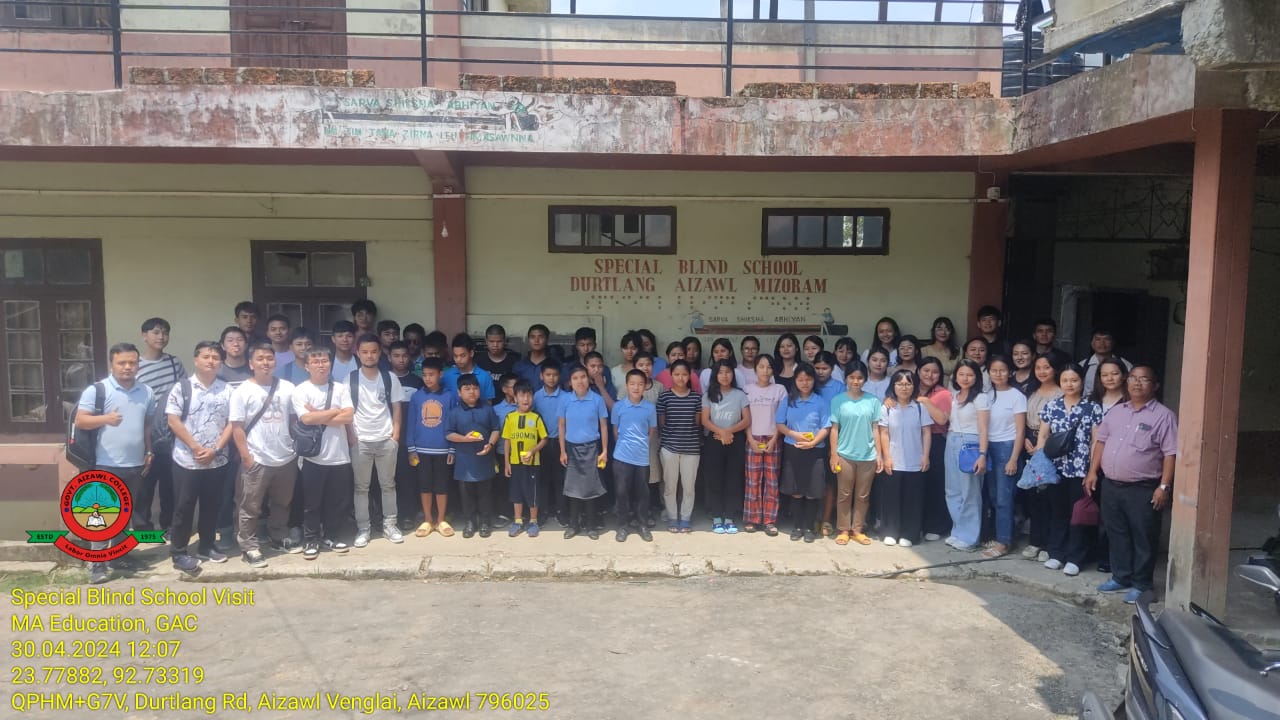On April 30, 2024, the Department of Education, after obtaining permission, visited Special Blind School, Durtlang, Aizawl, as a part of study tour programme for MA students as a paper on ‘Special Education for Exceptional Children’ is included in the MA syllabus. All students from the school as well as all visitors gathered for interaction where questions were responded by the school principal. Later, the students showed and presented their writings using braille to the visitors. Some read passages from books in braille. The department looks forward to more interaction of this kind in the future and possibility of working together was discussed between the two institutions.