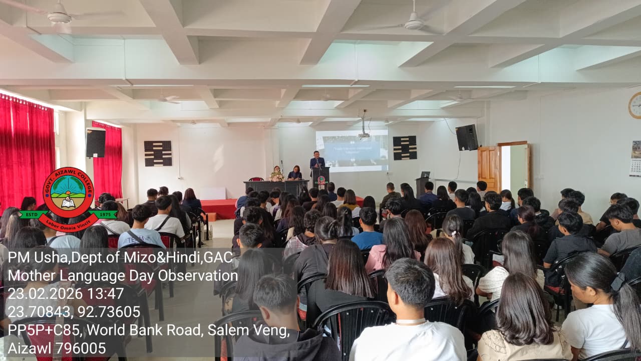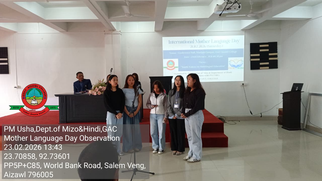 On February 23, 2026, at 1:30 PM, the Departments of Mizo and Hindi, in collaboration with PM Usha, organized International Mother Language Day 2026 at the Conference Hall, Mualpui. The theme for this year was “Youth Voices on Multilingual Education”. The programme was attended by students from the II, IV and VI semesters of the Mizo and Hindi departments, with assistance from department faculty, and had an estimated total attendance of 160 people.