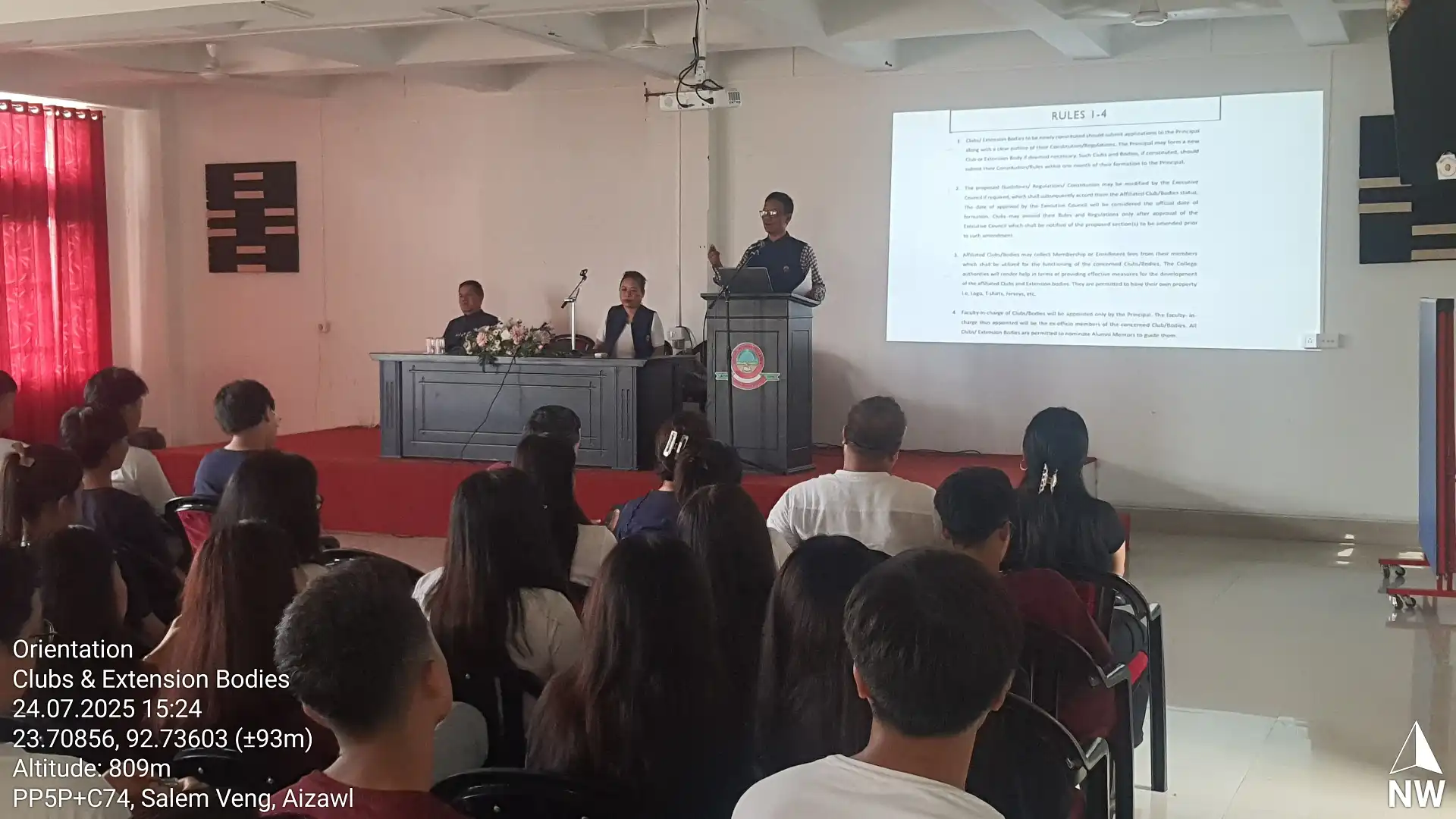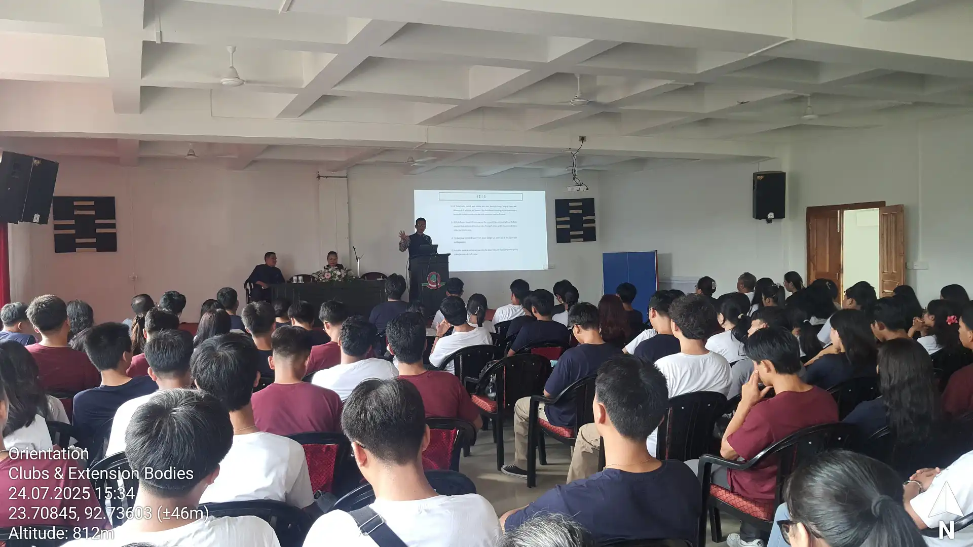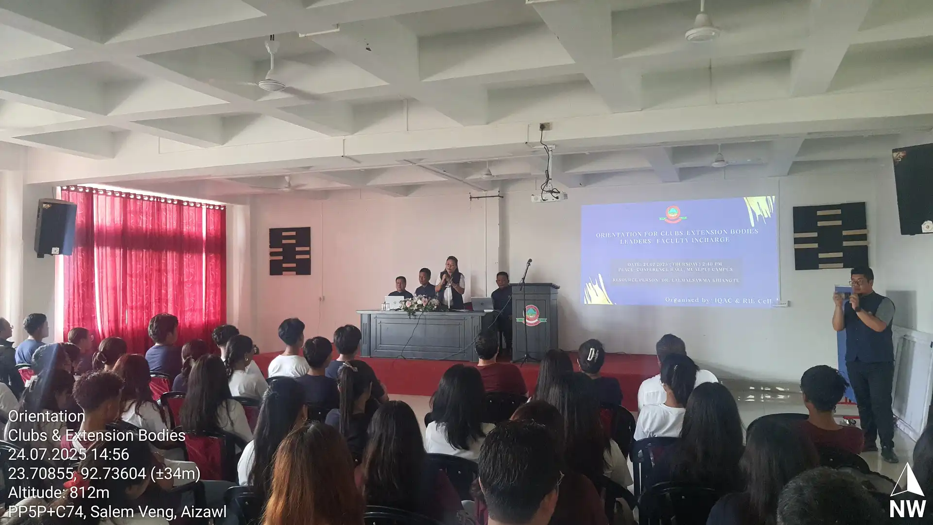 On July 24, 2025 at 2:30 PM, an orientation programme was organised by the IQAC and Research Innovation and Extension Cell for all the student-leaders and faculty members in charge of various clubs and extension bodies of the College. The programme was held at the Conference Hall, Mualpui Campus, attended by 101 students and 25 faculty members.