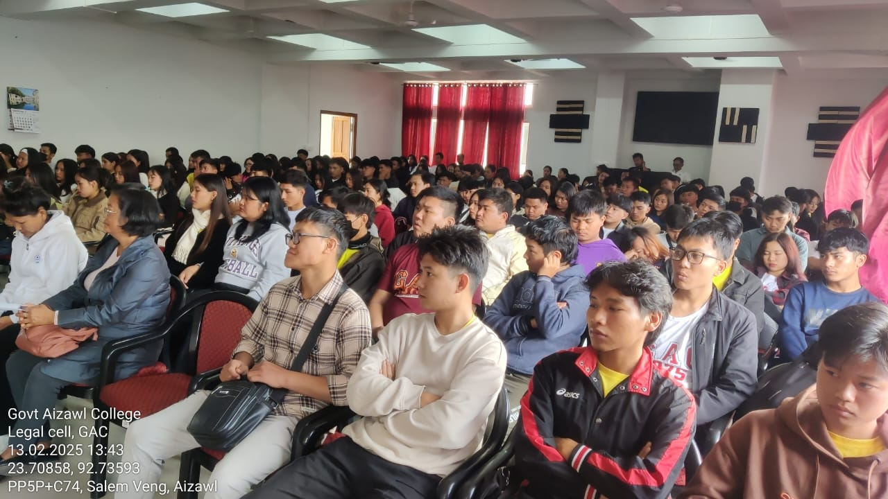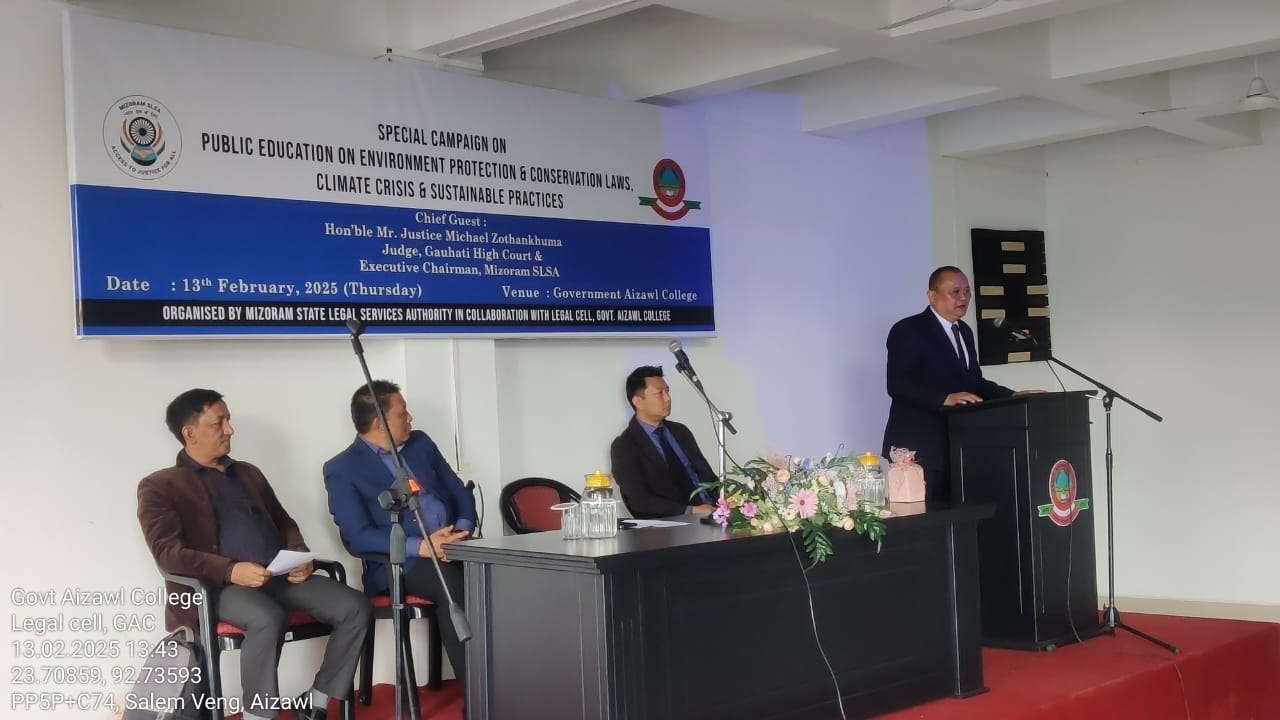 In collaboration with Government Aizawl College's Legal Cell, the Mizoram State Legal Services Authority held a special campaign on "Public Education on Environment Protection & Conservation Laws, Climate Change & Sustainable Practices" on February 13, 2025, at 1:30 p.m. in the Conference Hall at the Mualpui Campus. Participating were 161 students from the Department of Political Science, Mizo, English, and History.