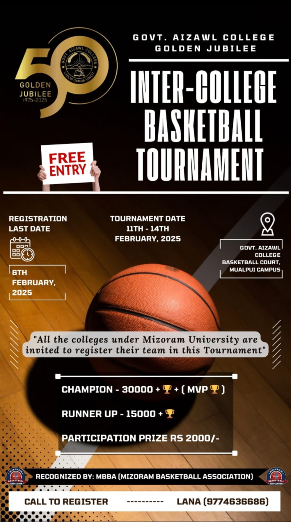 The Sports Committee and the Golden Jubilee Committee of Government Aizawl College successfully organized an Inter-College Basketball Tournament during February 11-14, 2025 at the Basketball Court, Mualpui campus of Government Aizawl College. The event was sponsored by Khatla TBL and recognized by the Mizoram Basketball Association (MBBA).